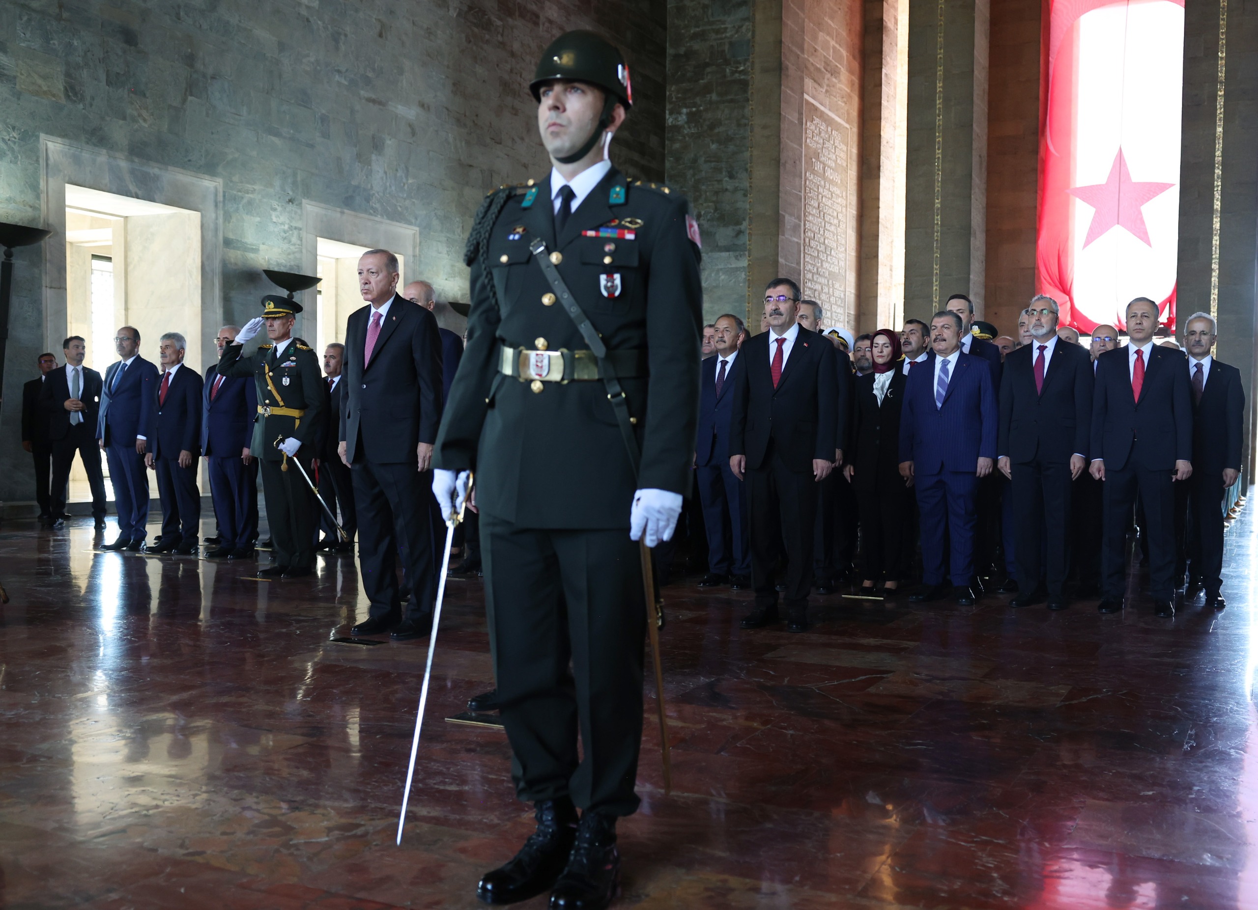 Devlet erkanının Aslanlı Yol’da yürüyüşü ile başlayan tören, Cumhurbaşkanı Erdoğan’ın, Atatürk’ün mozolesine ay yıldız motifli çelengi bırakmasıyla devam etti. Saygı duruşunun ardından İstiklal Marşı okundu. Daha sonra Misak-ı Milli Kulesi’ne geçilerek burada Anıtkabir Özel Defteri imzalandı.