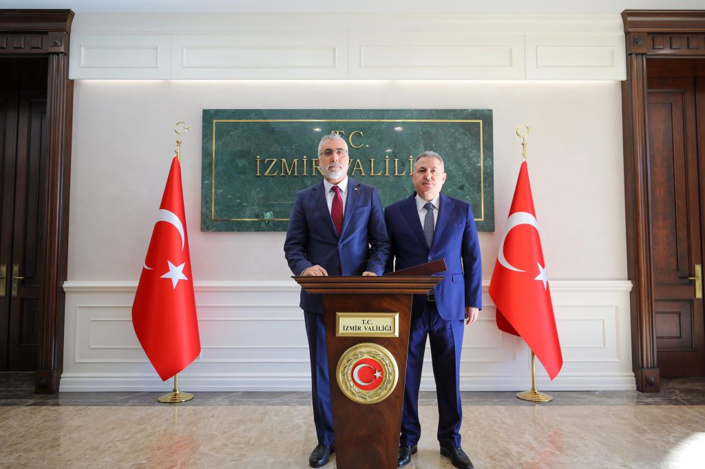 Kentteki ziyaretleri kapsamında ilk olarak İzmir Valiliği’ni ziyaret eden Bakan Vedat Işıkhan, İzmir Valisi Süleyman Elban ile görüştü. Işıkhan, Şeref Defteri’ni imzaladı ve Vali Elban’dan kentin ihtiyaçları ve yapılan çalışmalar hakkında bilgi aldı.