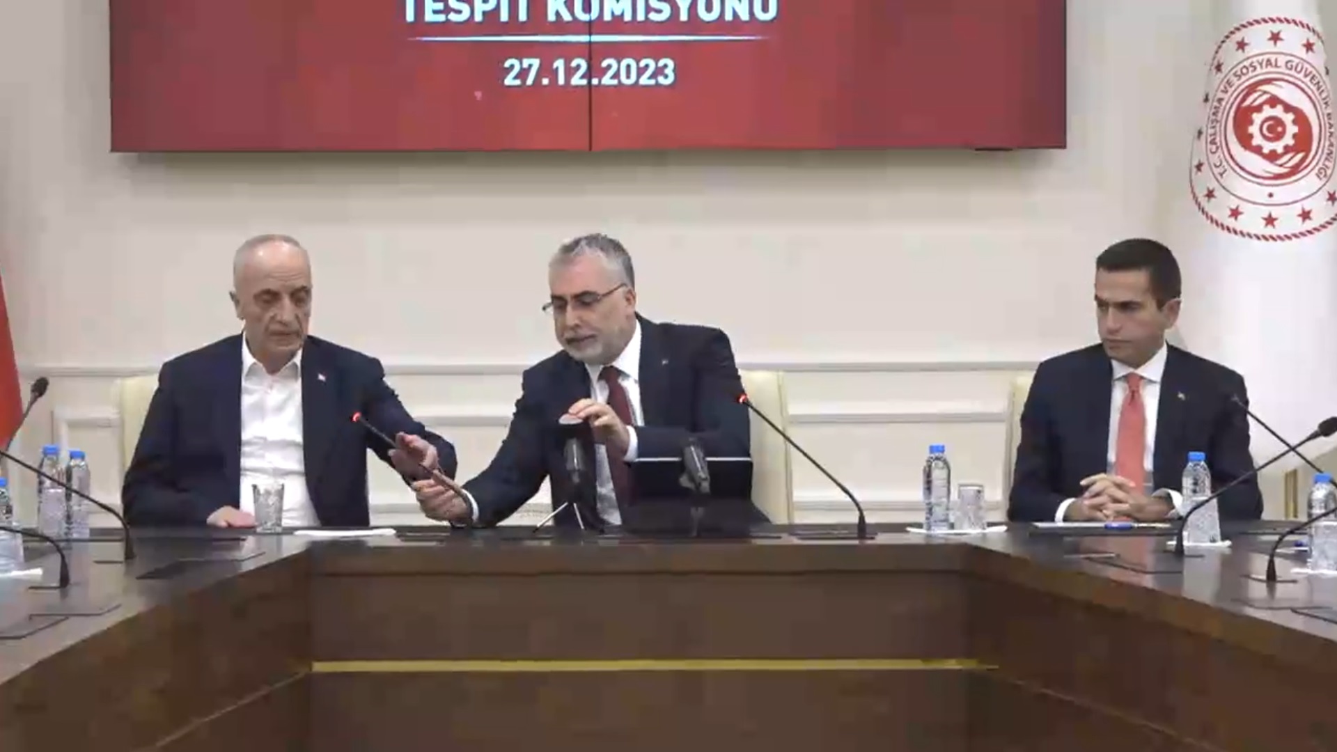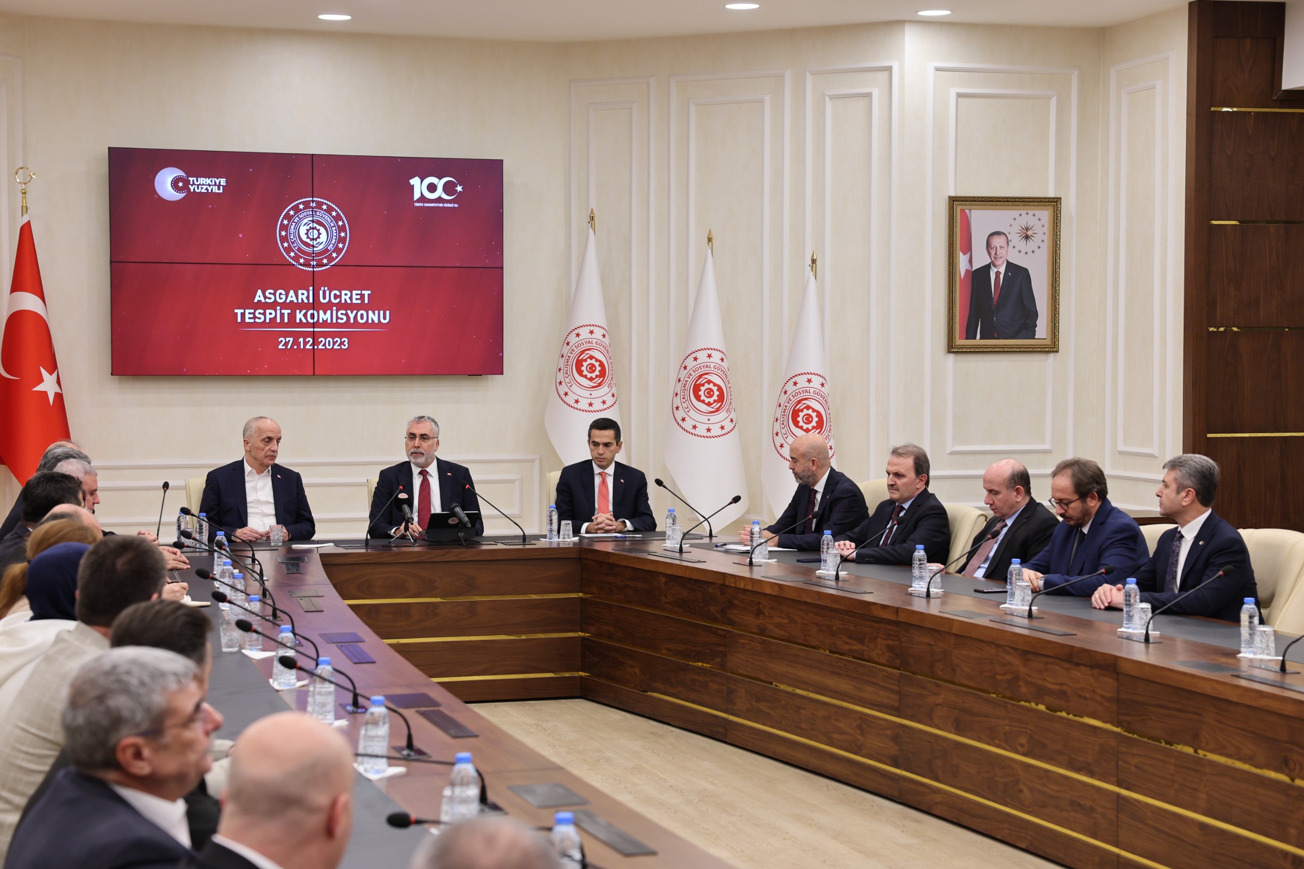 Bakan Işıkhan, bir sosyal koruma ücreti olan asgari ücretin, çalışma hayatındaki ücret politikalarının en alt sınırını temsil ettiğini hatırlatarak, “Komisyonun nihai hedefi tüm tarafların görüşlerini, taleplerini ve mevcut sosyo-ekonomik koşulları gözeterek bu sınırı belirlemektir. Bakanlık olarak bu süreçte asli görevimiz ise işçi ve işveren temsilcilerimiz arasında bir hakem rolü üstlenmektir. Öncelikle, bu süreci olumlu ve makul yaklaşımlarıyla ortak bir mutabakat zemininde yürüten tüm paydaşlara, Türkiye İşçi Sendikaları Konfederasyonu Türk-İş Başkanı Sayın Ergün Atalay’a ve Türkiye İşveren Sendikaları Konfederasyonu TİSK Başkanı Sayın Özgür Burak Akkol’a ve komisyon üyelerine teşekkür ediyorum” diye konuştu.