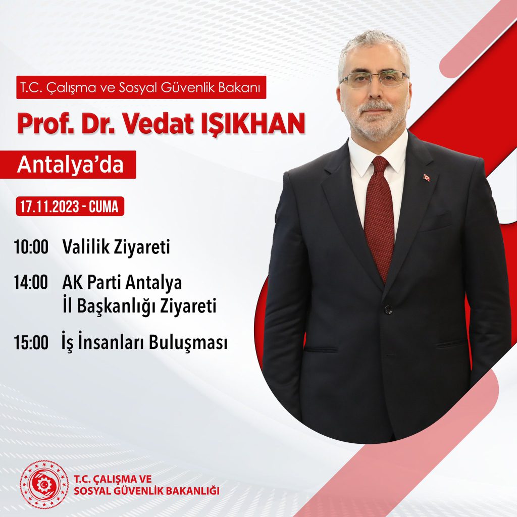 8 Kasım 2023: Çalışma ve Sosyal Güvenlik Bakanı Prof. Dr. Vedat Işıkhan, AK Parti Nevşehir Milletvekili Sayın Emre Çalışkan ve İlim Yayma Cemiyeti Kayseri Şube Başkanı Sayın Oğuz Memiş’i Bakanlıkta ağırladı.