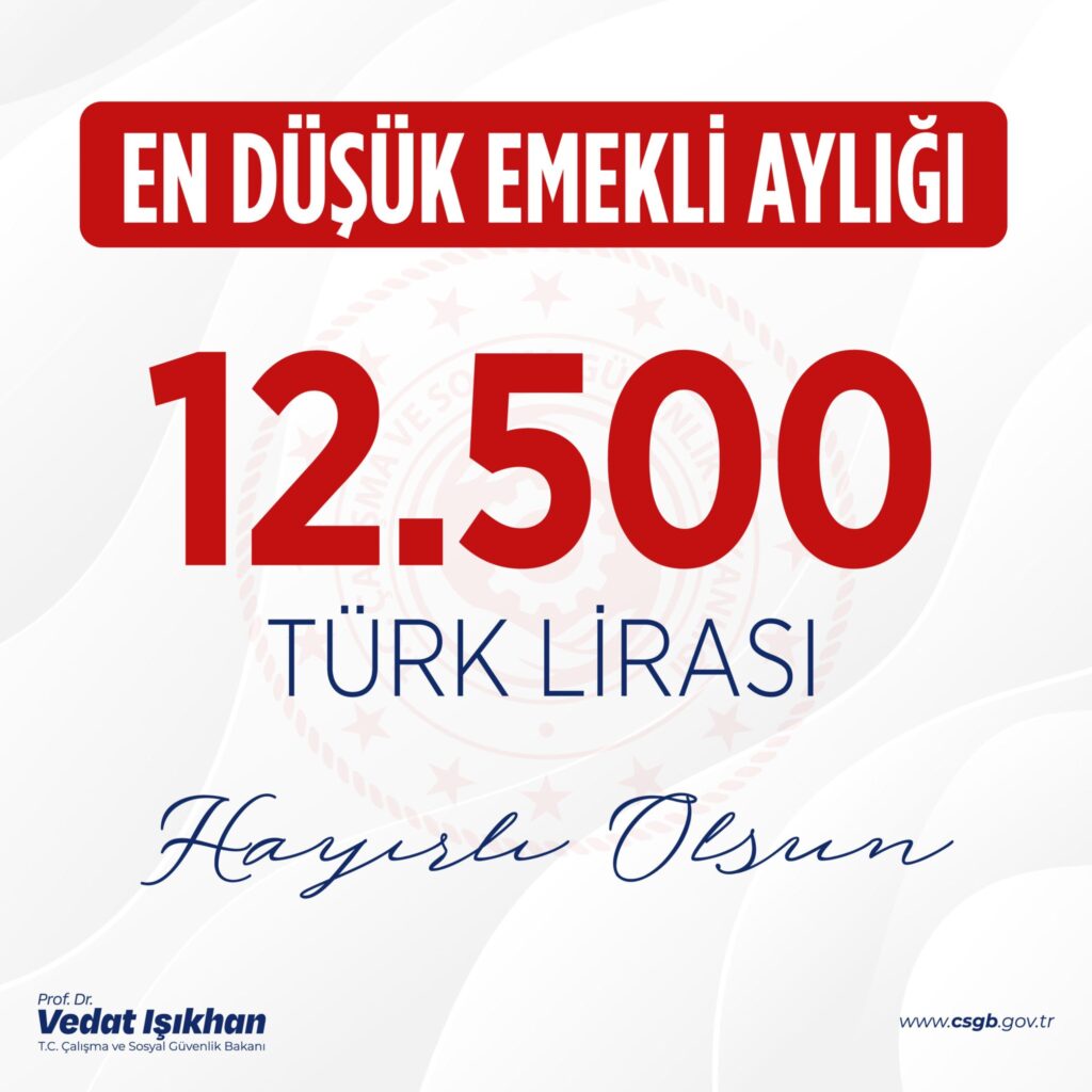 16 Temmuz 2024: En düşük emekli aylığının 12 bin 500 liraya yükseltilmesi ile ilgili kanun taslağı TBMM’ye sunuldu. Türkiye’nin emektarı kıymetli emeklilerimizin refahını artırmak ve sosyal haklarını genişletmek için yeni çalışmalarımızı hayata geçirmeye devam edeceğiz. Ömrünü ülkemizin kalkınmasına adamış tüm emeklilerimizin yanında olmaya devam edeceğiz. Milletimize, emeklilerimize ve kıymetli ailelerine hayırlı olsun.